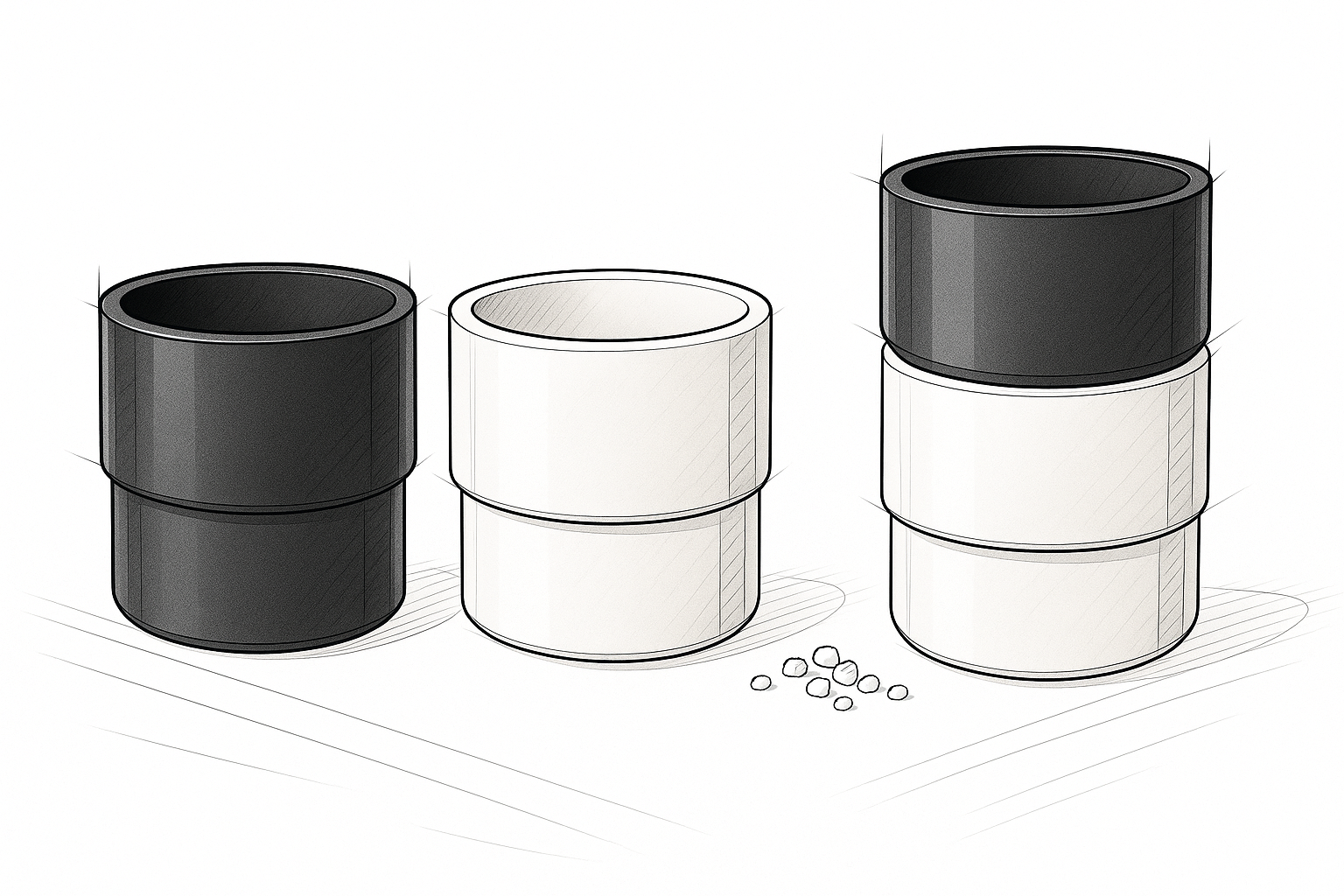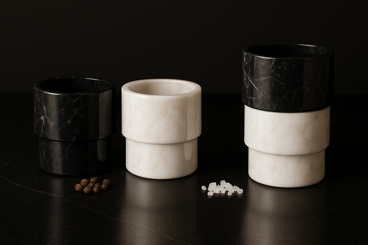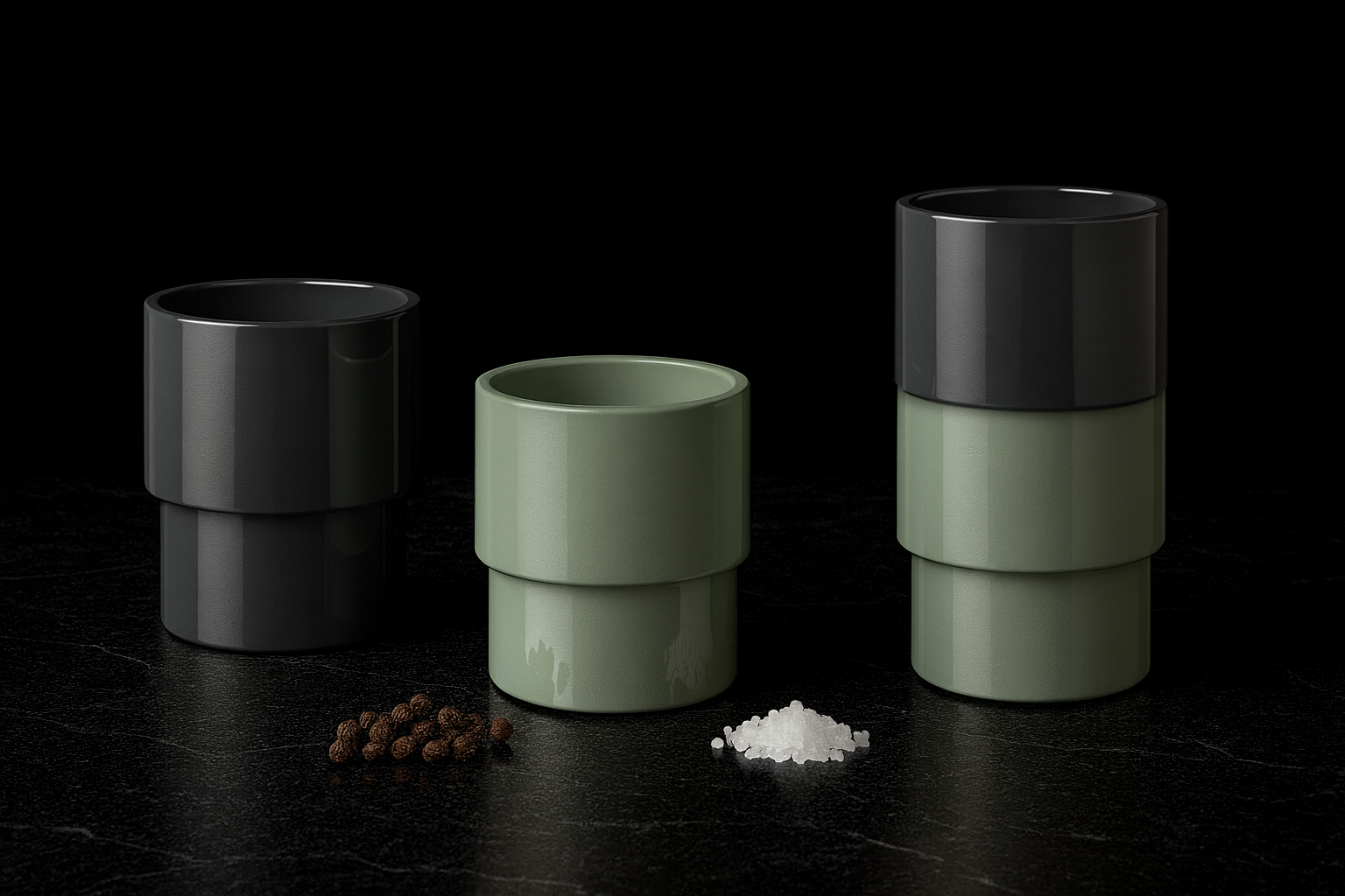 In addition to usability, the social ritual of passing salt and pepper across a dining table informed a secondary design opportunity: stackability. By allowing the grinders to neatly nest together, the design becomes both space-efficient and satisfying to interact with—encouraging a more intentional handoff and a visually unified presence on the table or countertop.